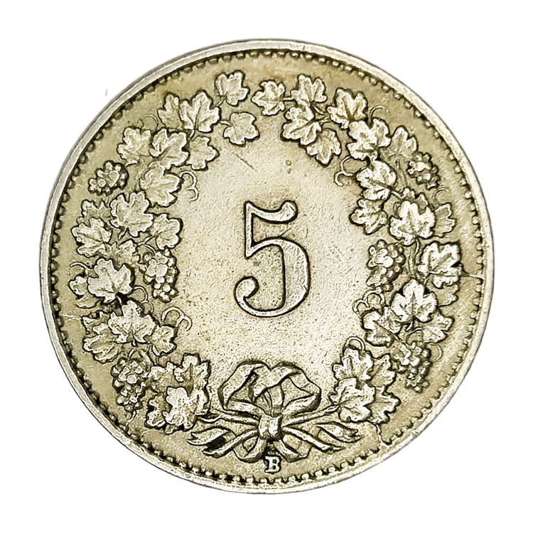The reverse side showcases a detailed wreath of grapevines, intertwined with a ribbon, encircling the bold numeral "5". This design reflects Switzerland’s strong agricultural heritage.